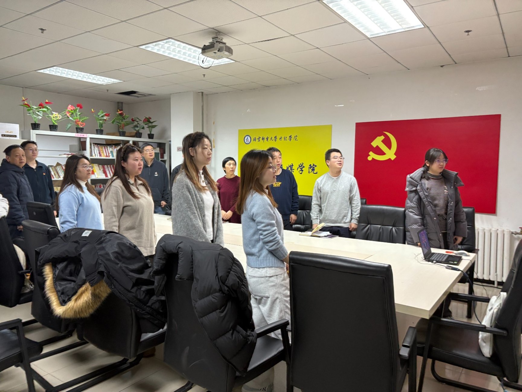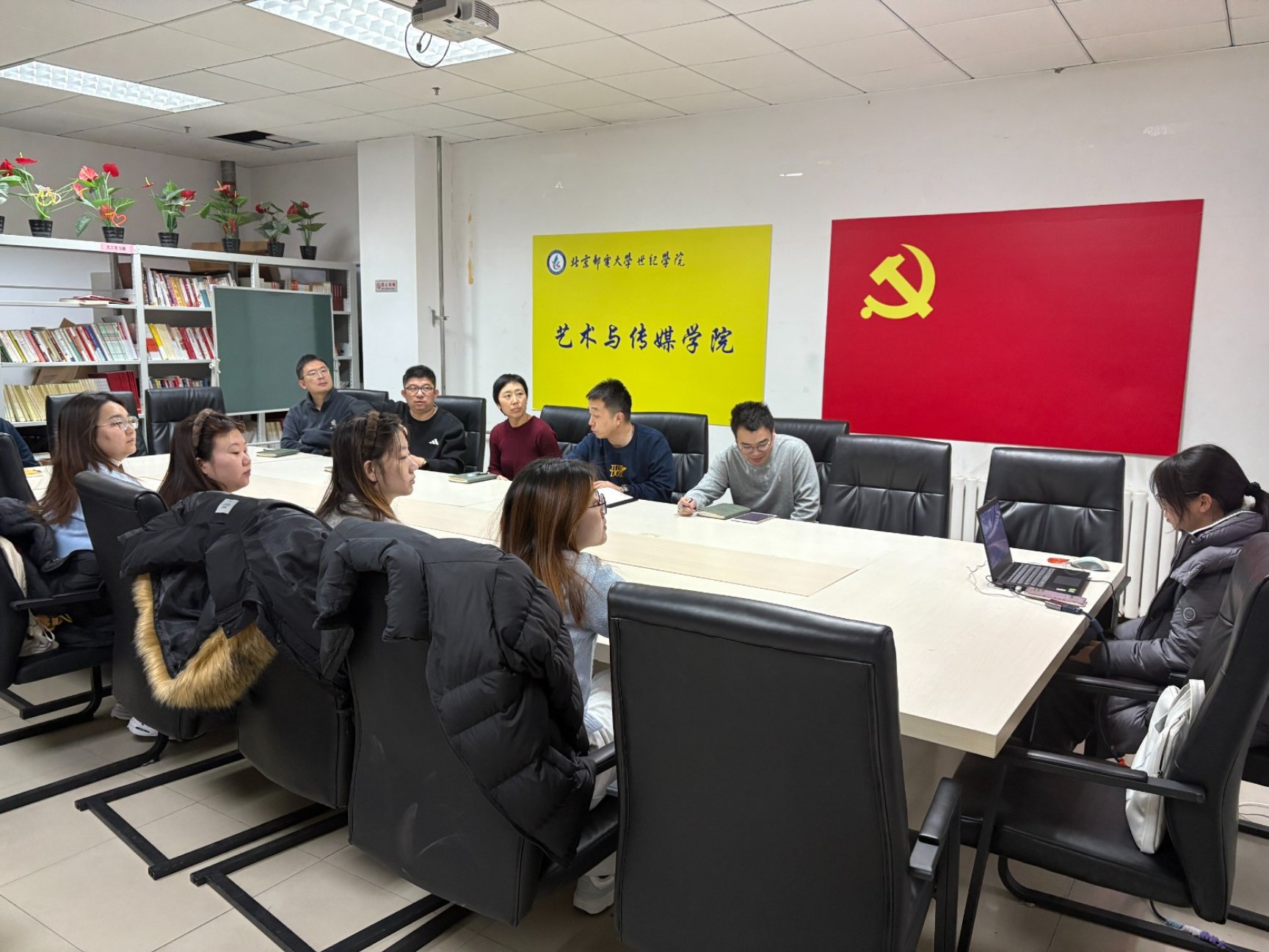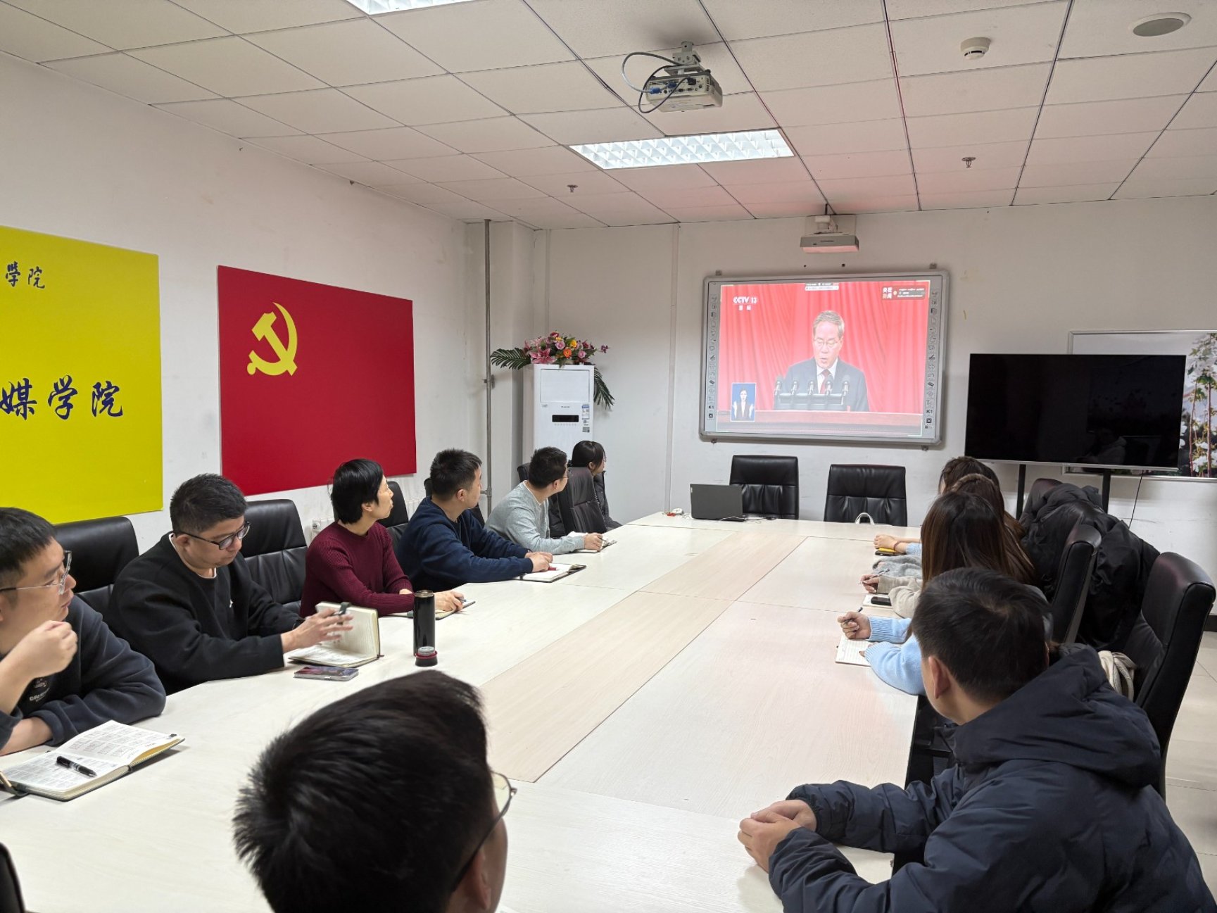 2026年3月5日,艺术与传媒学院教工党支部、学生党支部组织师生代表集中收看2026年全国两会开幕直播,深入学习国务院总理李强所作的政府工作报告。传媒院教工党支部书记姬世祥、学生党支部书记赵鑫及师生党员、入党积极分子、预备党员和学生代表共同参与学习。