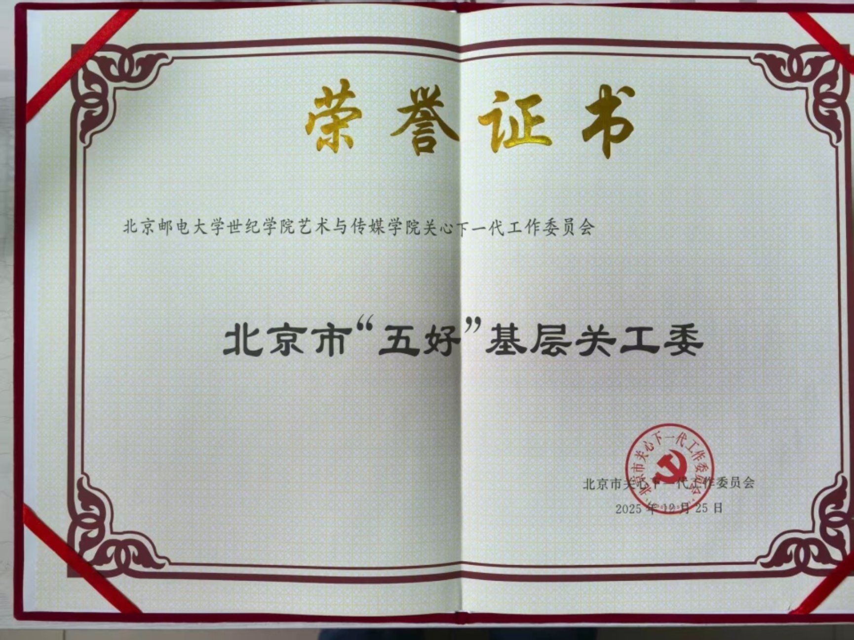近日,北京市关心下一代工作委员会正式公布2025年北京市“五好”基层关工委认定名单。艺术与传媒学院关心下一代工作委员会凭借扎实的组织建设、创新的活动载体和显著的育人成效,成功入选,荣获“北京市‘五好’基层关工委”荣誉称号,标志着艺术与传媒学院关心下一代工作迈上新台阶。
