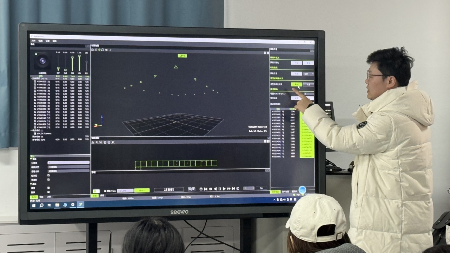 软件实操环节聚焦青瞳视觉自研CMAvatar系统,工程师重点演示了该系统集成Kinetiq AI解算器后的核心功能,包括相机智能校准、刚体物品精准捕捉、动捕演员动作实时驱动等应用流程,全面呈现了从数据采集到数字角色驱动的完整技术路径。相较于传统动捕系统,集成AI解算器大幅减少人工修正成本,有效解决了传统动捕流程中的核心痛点,让参训教师有了更清晰的认知。现场交流中,通信与信息工程系教师结合无人机技术应用,与工程师就动捕+AI技术在智能控制、虚拟仿真等领域的融合发展进行了深入探讨。