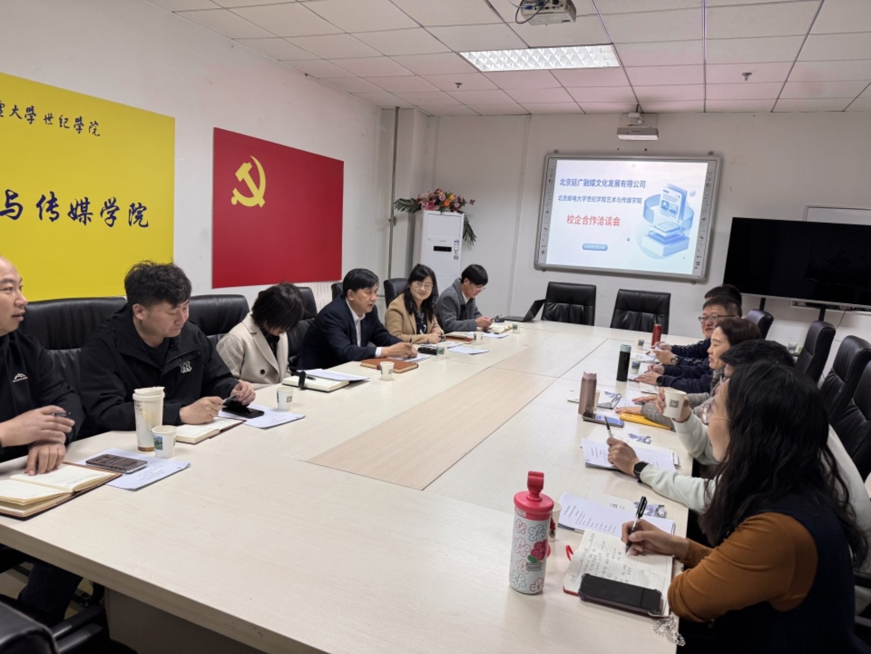北京延广融媒文化发展有限公司总经理孙守锴、副总经理兰玉芳及各部门经理,艺术与传媒学院院长淮永建、副院长陈薇、姬世祥等院方代表出席会议,双方就深化校企合作达成广泛共识。