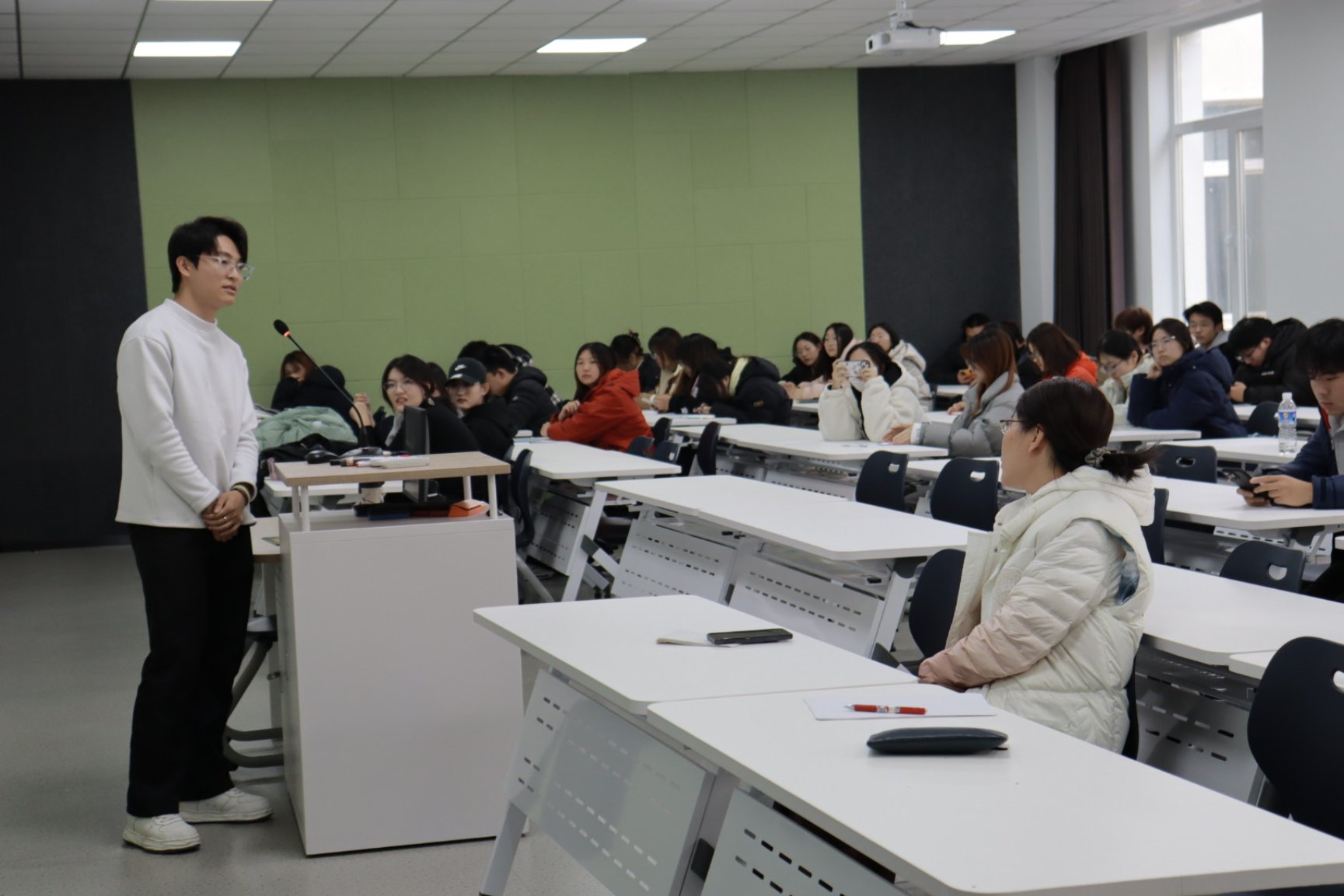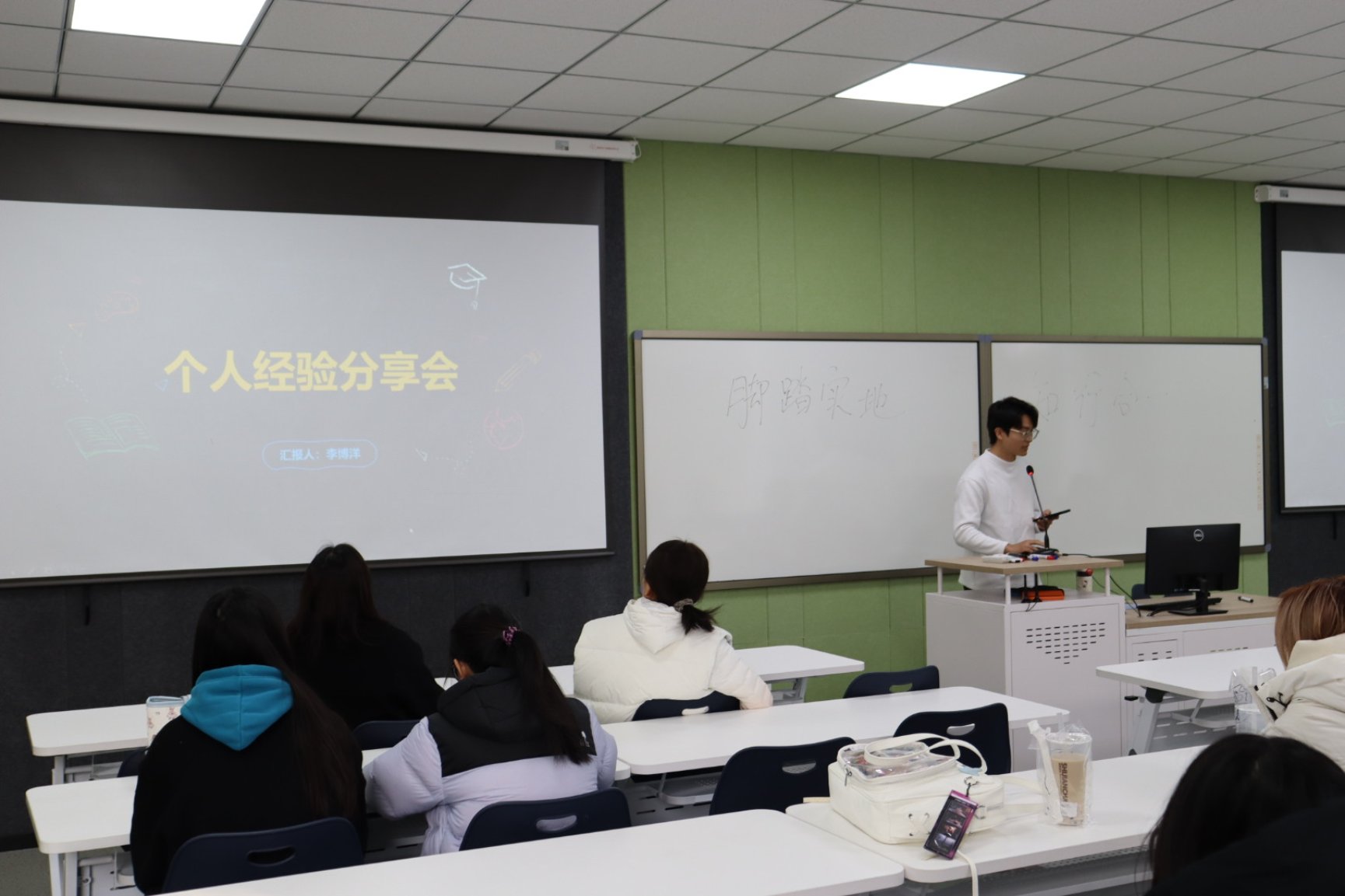拥有丰富实习经历的孟祥漪学长,围绕“实习那些事”展开了干货满满的分享,既拆解了实习中的实用技巧,也点明了容易踩坑的常见误区。为了让内容更直观易懂,她现场手写板书,条理清晰地罗列了“简历投递雷区”“职场沟通技巧”“核心能力锤炼”等关键要点,每一项都搭配具体说明。同时,她结合自身及身边人的真实实习案例,诚恳提醒学弟学妹:“实习不是简单打杂,而是在真实工作场景中积累经验、锚定职业兴趣的重要过程”,让分享既有理论指导,又具现实参考意义。