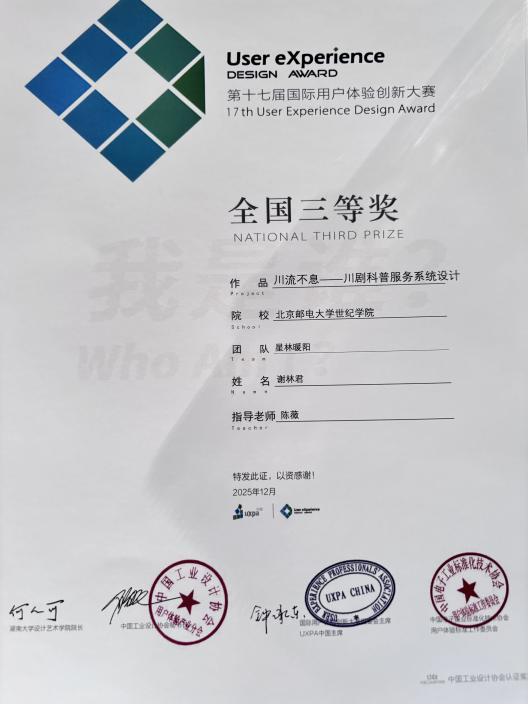 近日,艺术与传媒学院学子在近期参加的三个赛事中捷报频传,比赛包括第十七届国际用户体验创新大赛、2025年北京市大学生动漫设计竞赛和首届北京市大学生“人工智能+”创新大赛。