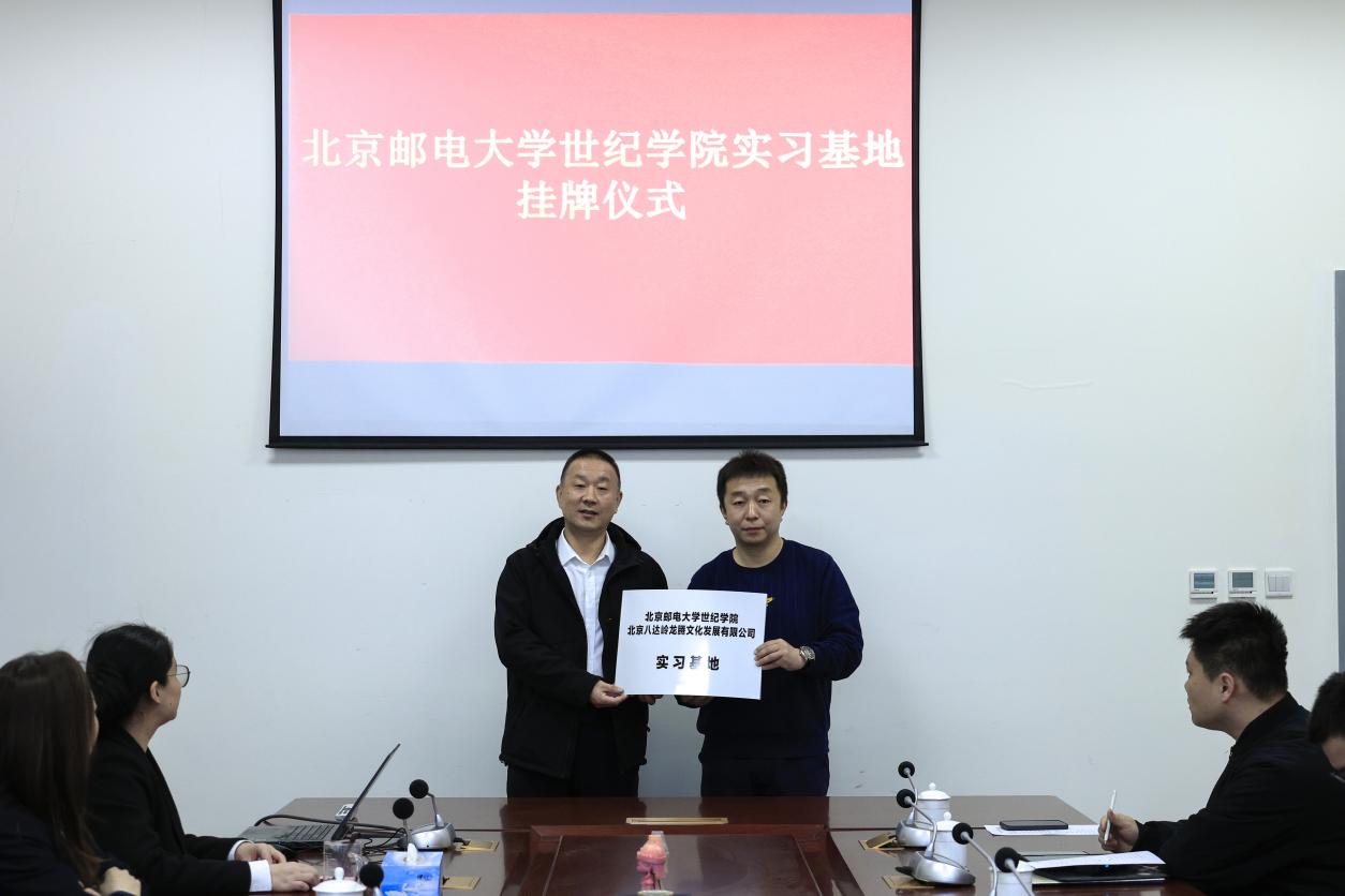 在热烈的氛围中,双方代表共同为实习基地揭牌,标志着北京邮电大学世纪学院艺术与传媒学院实习基地正式落户北京八达岭龙腾文化发展有限公司。