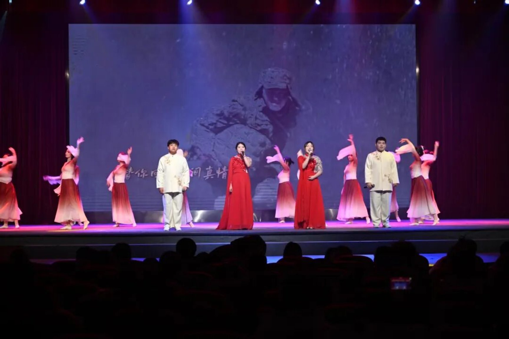 第二个节目歌舞《铭记》由学生演唱并配以庄重的舞蹈编排。领唱同学以饱满而深情的歌声将情感层层递进。舞者们动作整齐划一,充满力量感,灯光随着音乐节奏变换,营造出梦幻的舞台效果。以清亮而富有感染力的嗓音唱出“挥手迎着一阵风”,结合合声演唱与肢体表达,再现山河回响与英雄情怀,传递“清澈的春水繁星”的奉献精神,歌声与舞蹈交织,情感与艺术共鸣,将“铭记”二字从抽象的概念化为具象的感动。