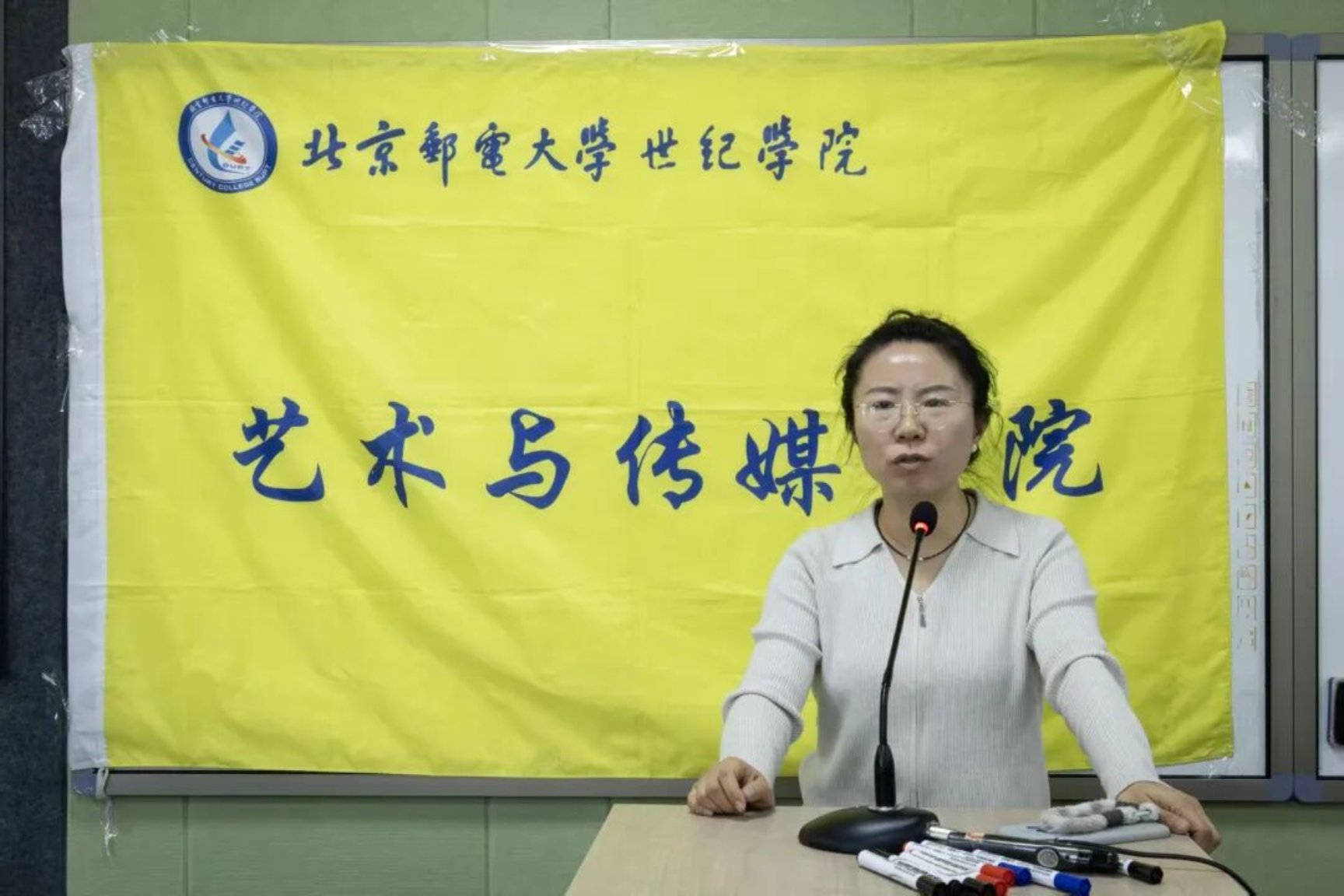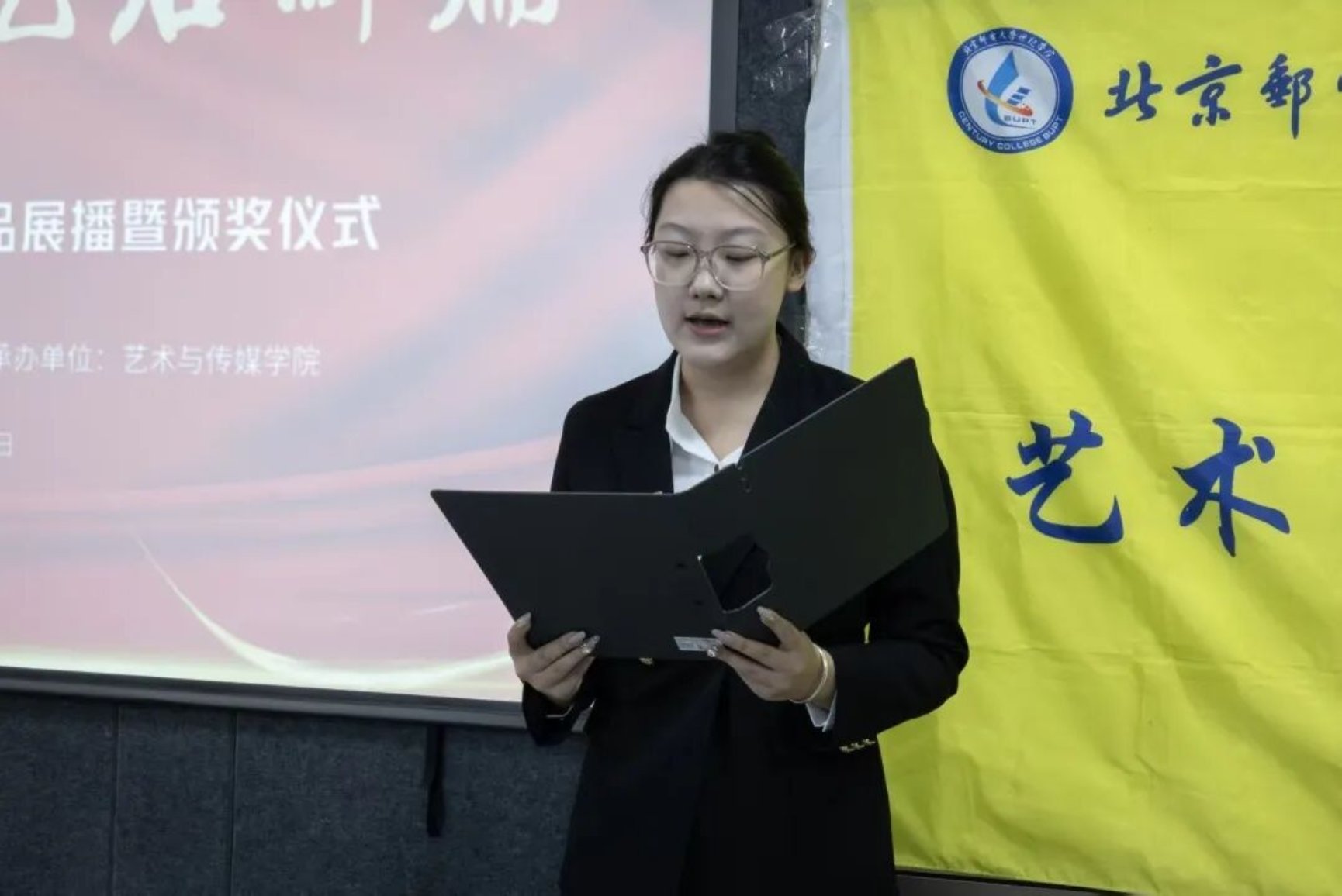 随着各奖项逐一揭晓,现场氛围持续升温。艺术与传媒学院院长淮永建为三等奖获奖选手颁发证书,学工部部长朱晓杰为二等奖获得者颁奖,党委书记王常军为一等奖选手授奖。每一份荣誉的背后,都是对创作者心血与创意的肯定。颁奖间隙,获奖代表焦雅萱同学登台分享创作心得,从灵感萌发到技术打磨,她的真挚讲述让在场师生感受到青年创作者对AI创作的热忱与坚守。