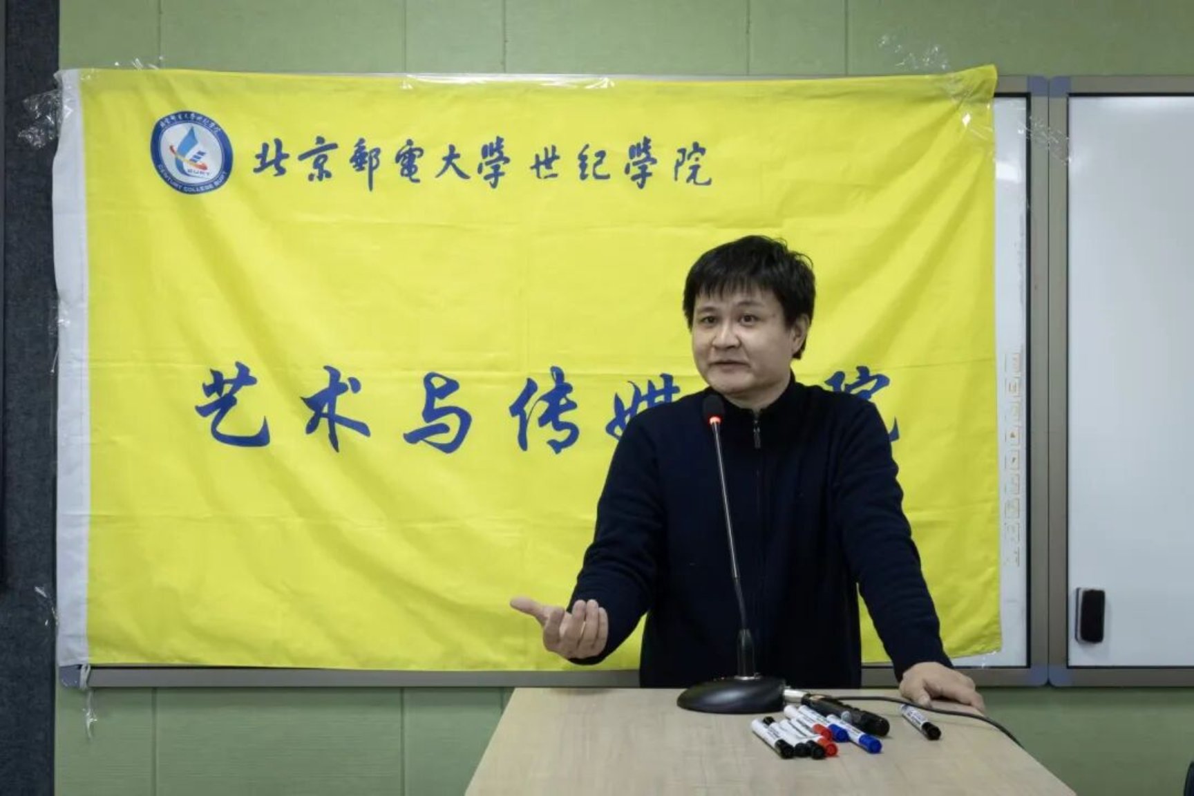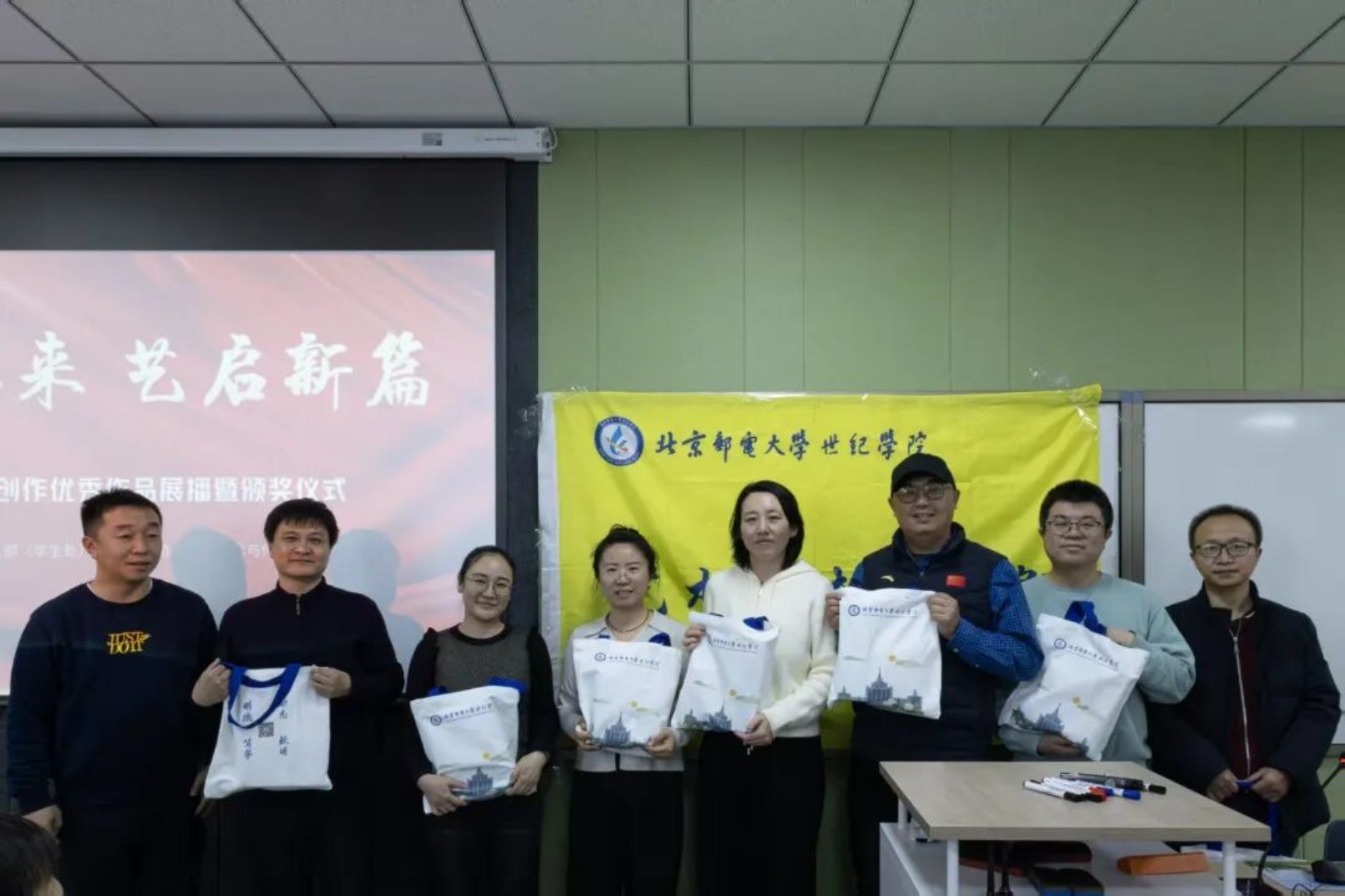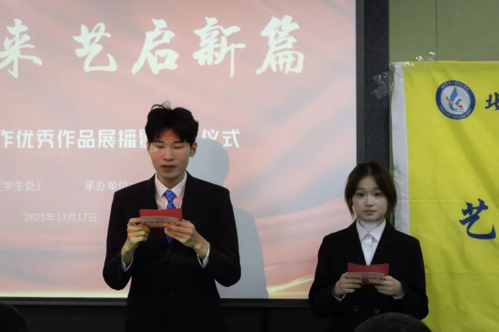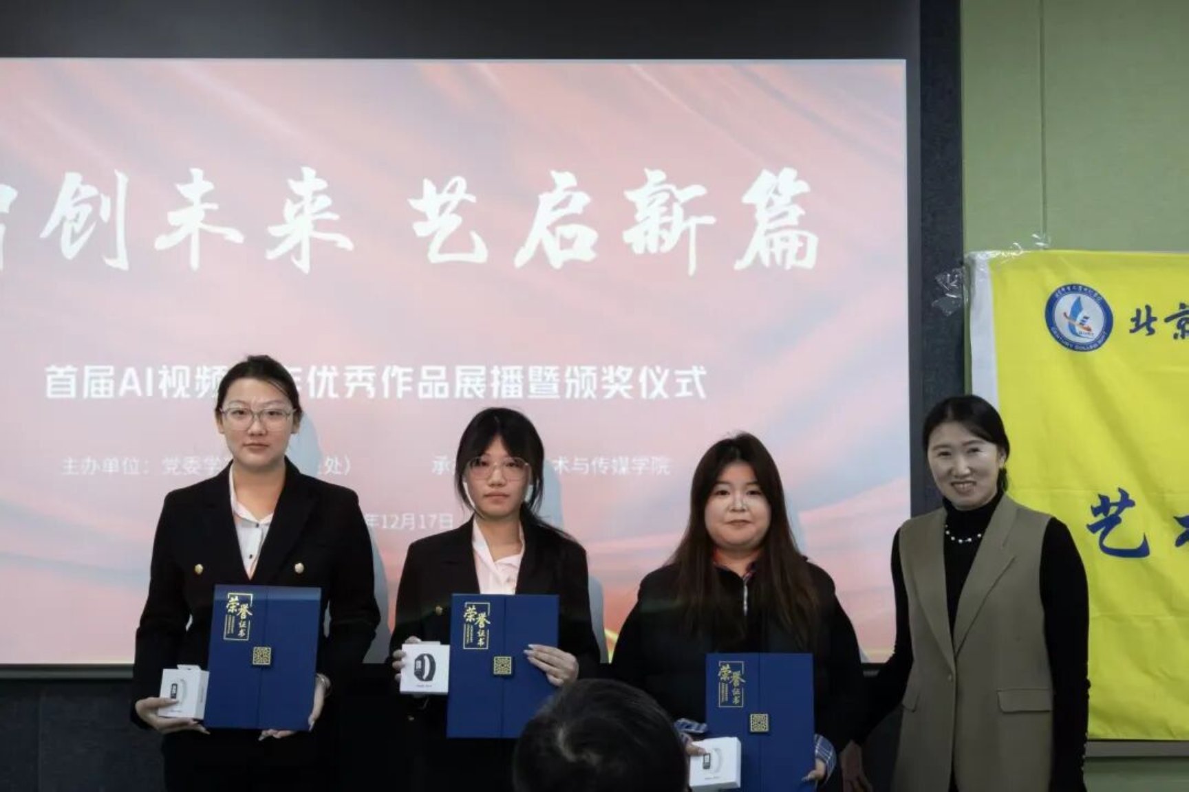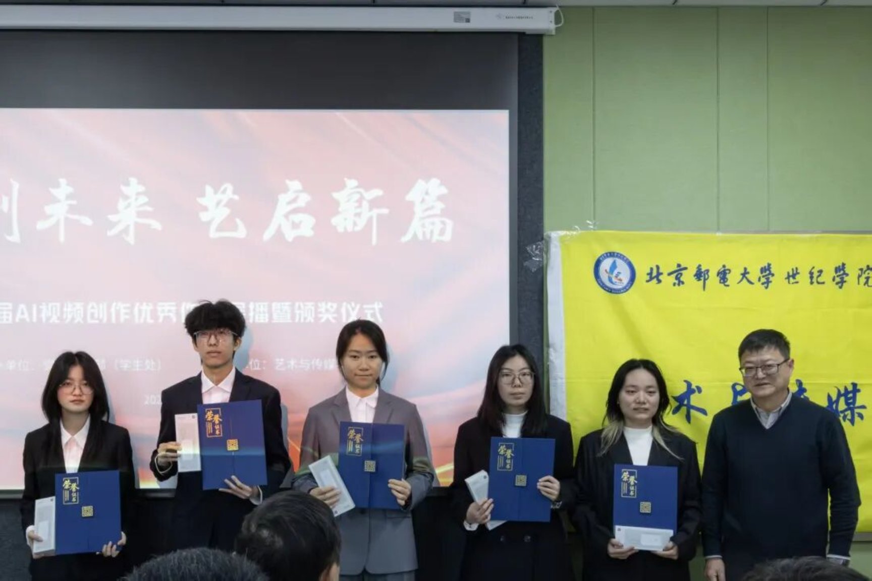 科技赋能创意,AI点亮未来。为深入贯彻国家“数字中国”战略,推动数字文化与人工智能深度融合,2025年12月17日,由党委学工部(学生处)主办、艺术与传媒学院承办的首届“智创未来”AI视频创作大赛优秀作品展播暨颁奖典礼在学思楼218教室顺利举行。学院党委书记王常军、党委学工部部长朱晓杰、艺术与传媒学院院长淮永建等领导,以及评委老师、参赛选手代表共同出席活动,见证创意与技术碰撞的荣耀时刻。